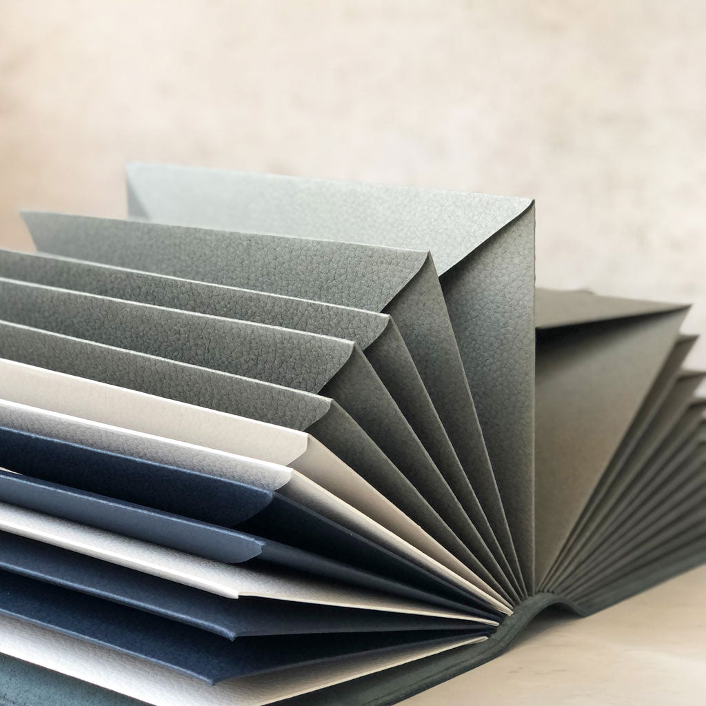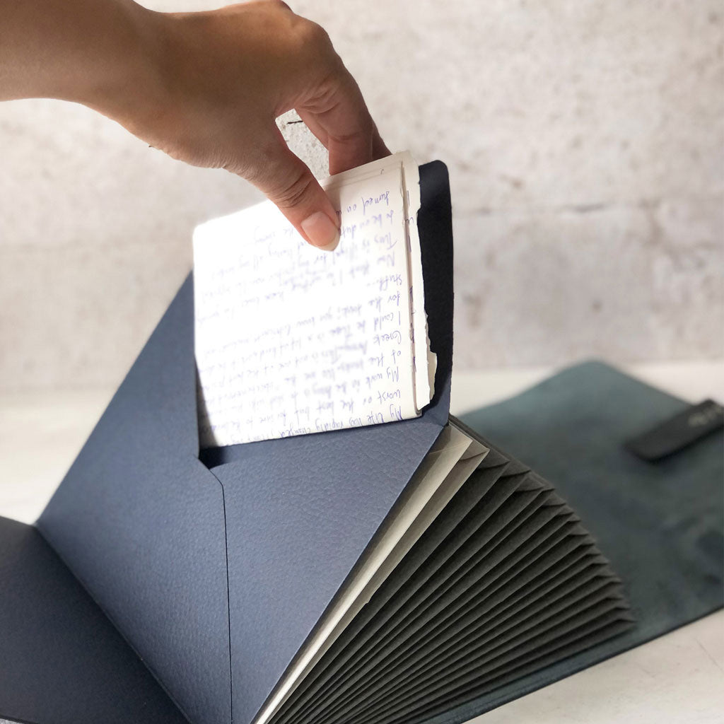 Soulfully nostalgic memory books made entirely of envelopes, hand bound into sumptuous leather. A unique & sentimental gift for a milestone event, birth(day), retirement or wedding, to fill with letters or mementos that will be treasured for years to come.