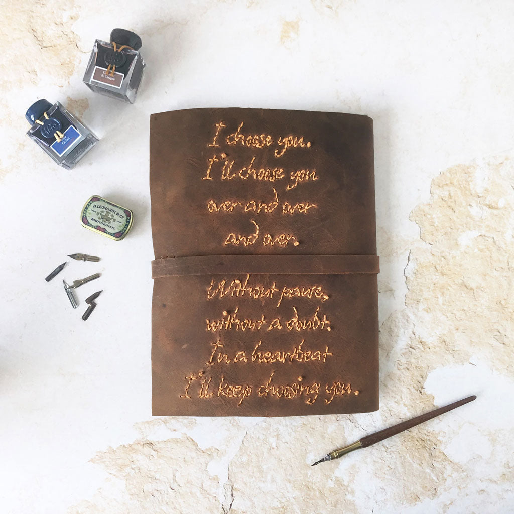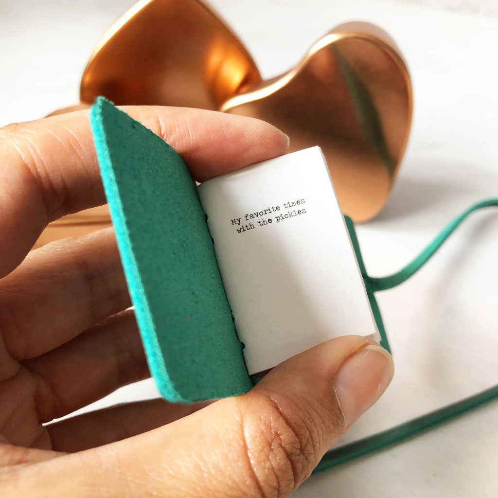 Tenderly endearing miniature leather bound journals that fit into the palm of your hand, custom printed with words from your heart, to fill with precious memories.