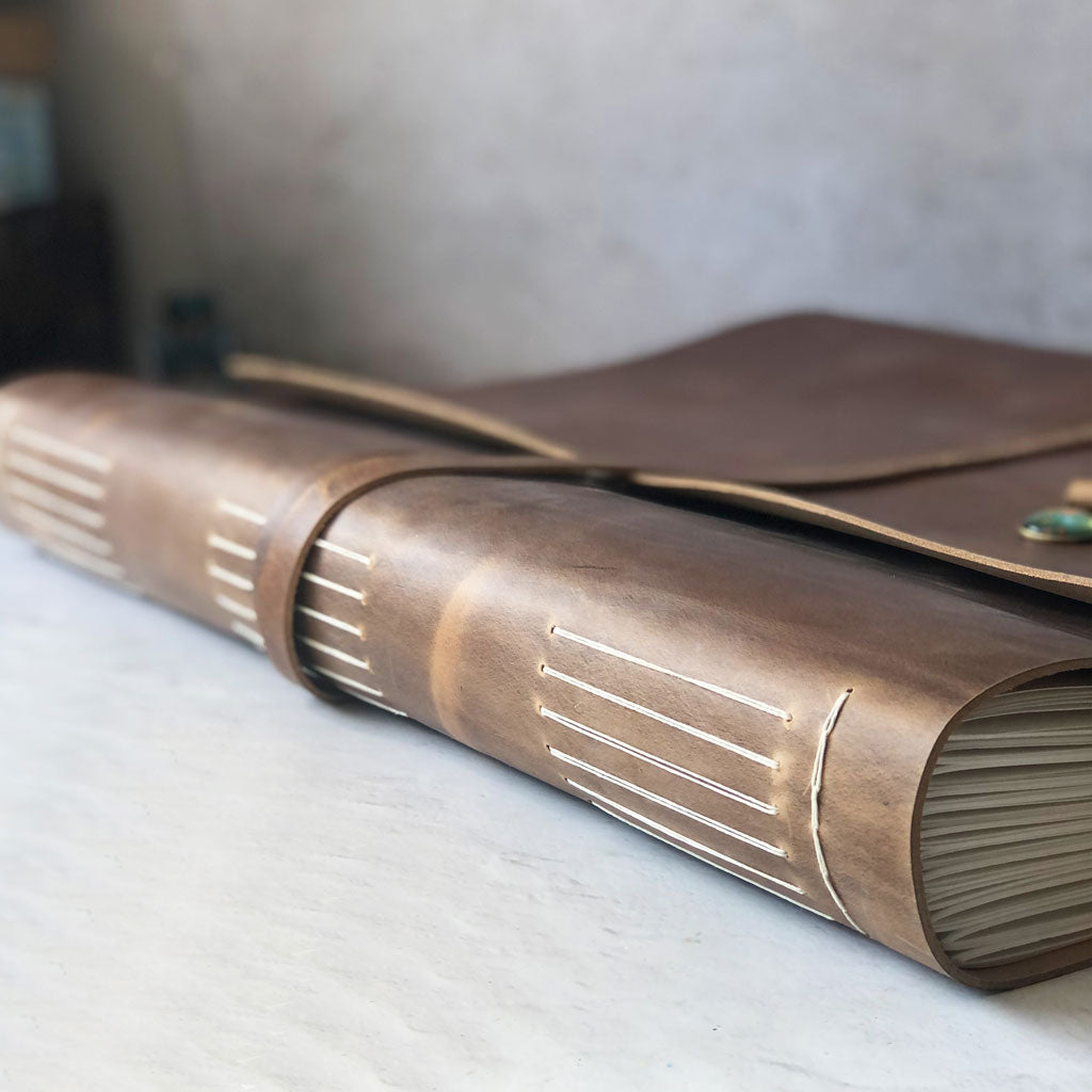 BINDING: Traditionally crafted, the pages are stitched into the leather cover by hand using a long stitch binding with waxed Irish linen thread.