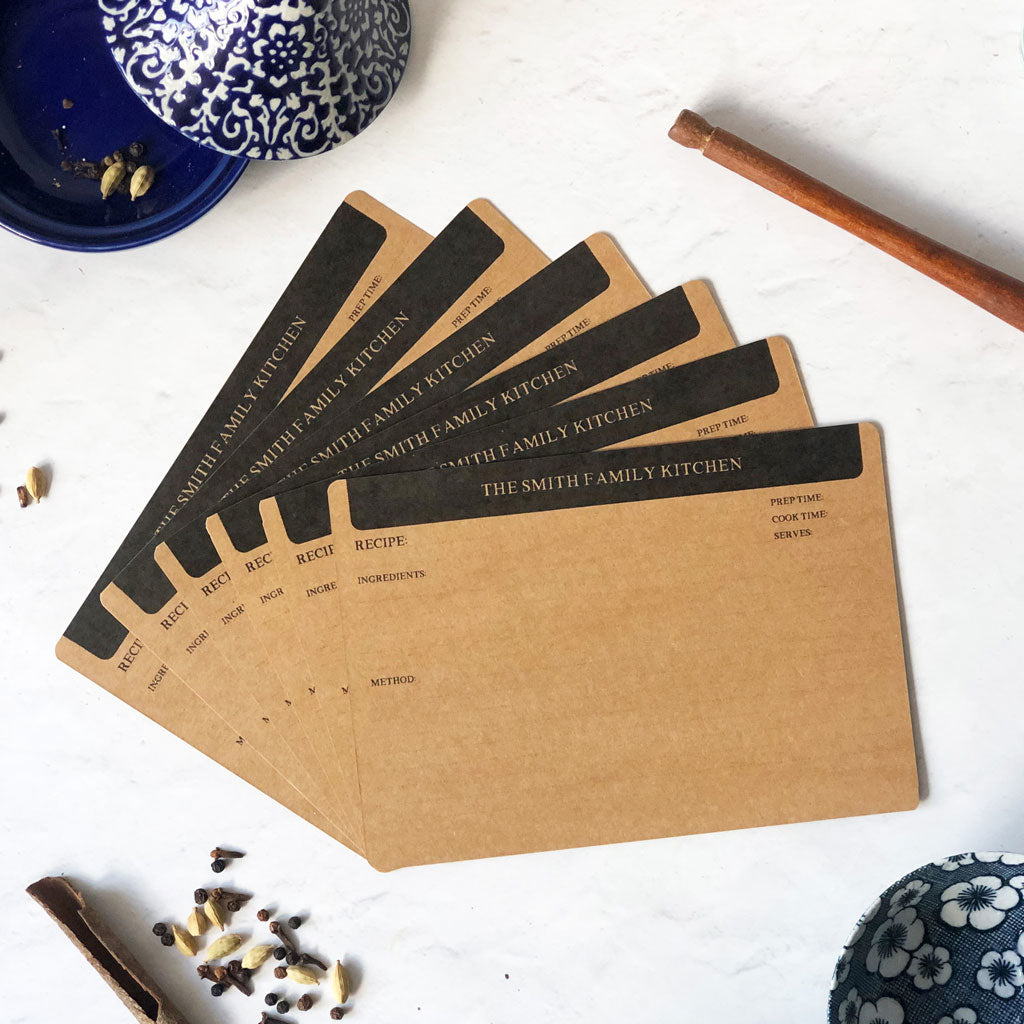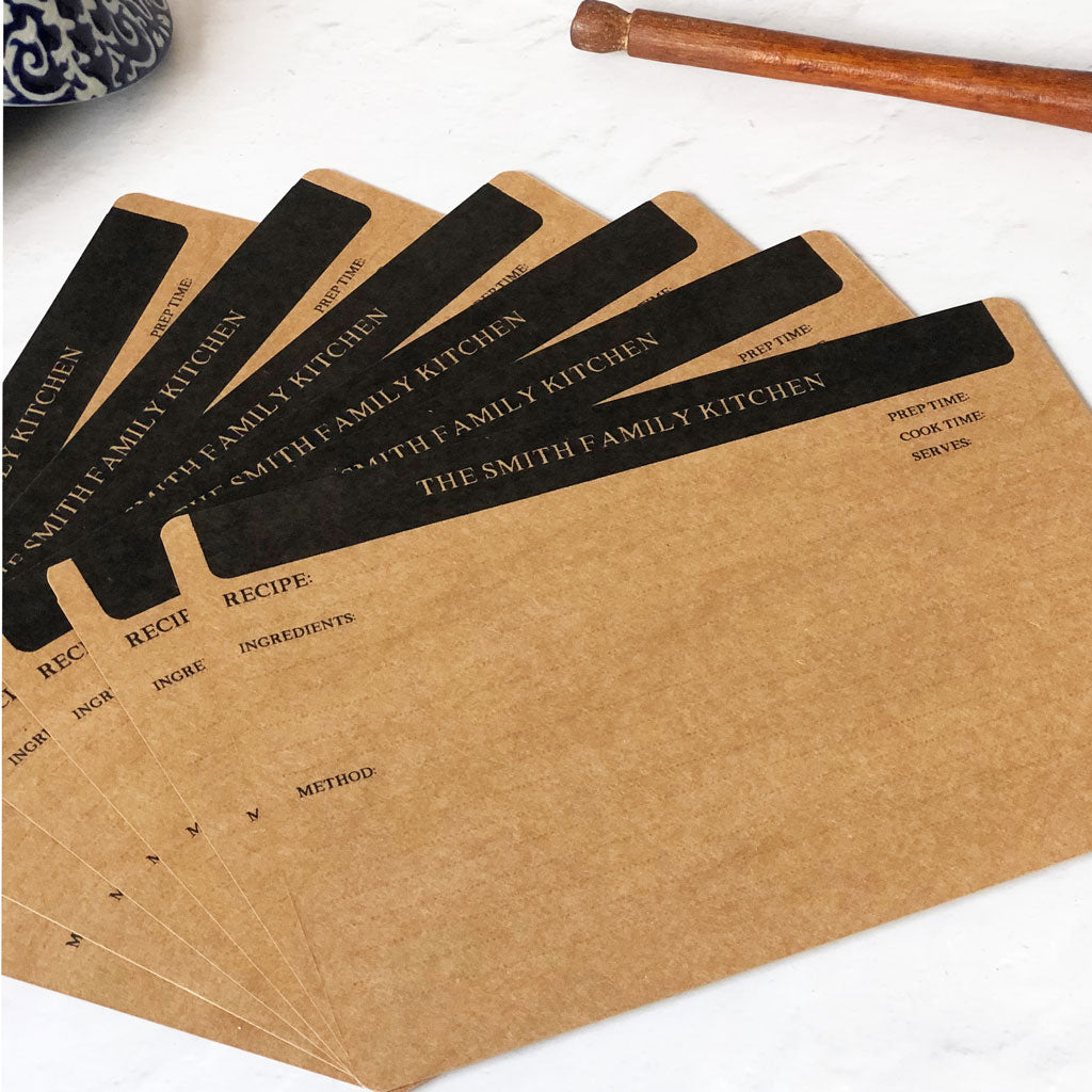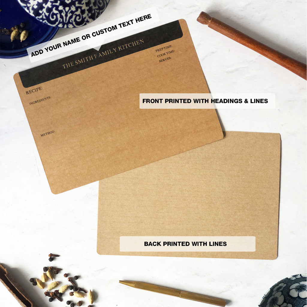Blank recipe cards personalised with a custom printed header in sets of 20, 40 or 60 cards. Convenient to use and can be hole punched by you to use as inserts in a binder or in a recipe box.