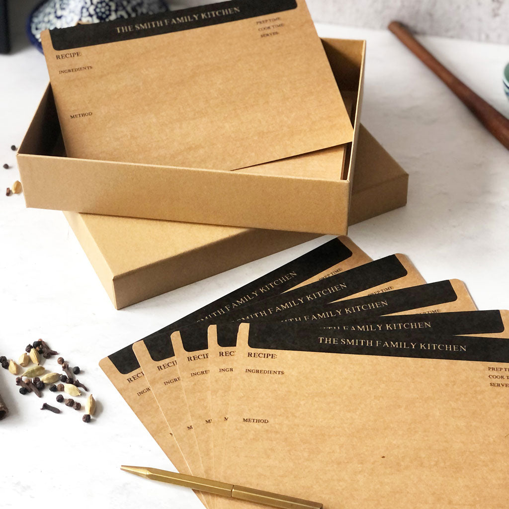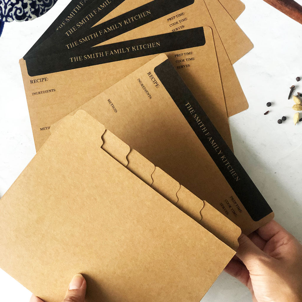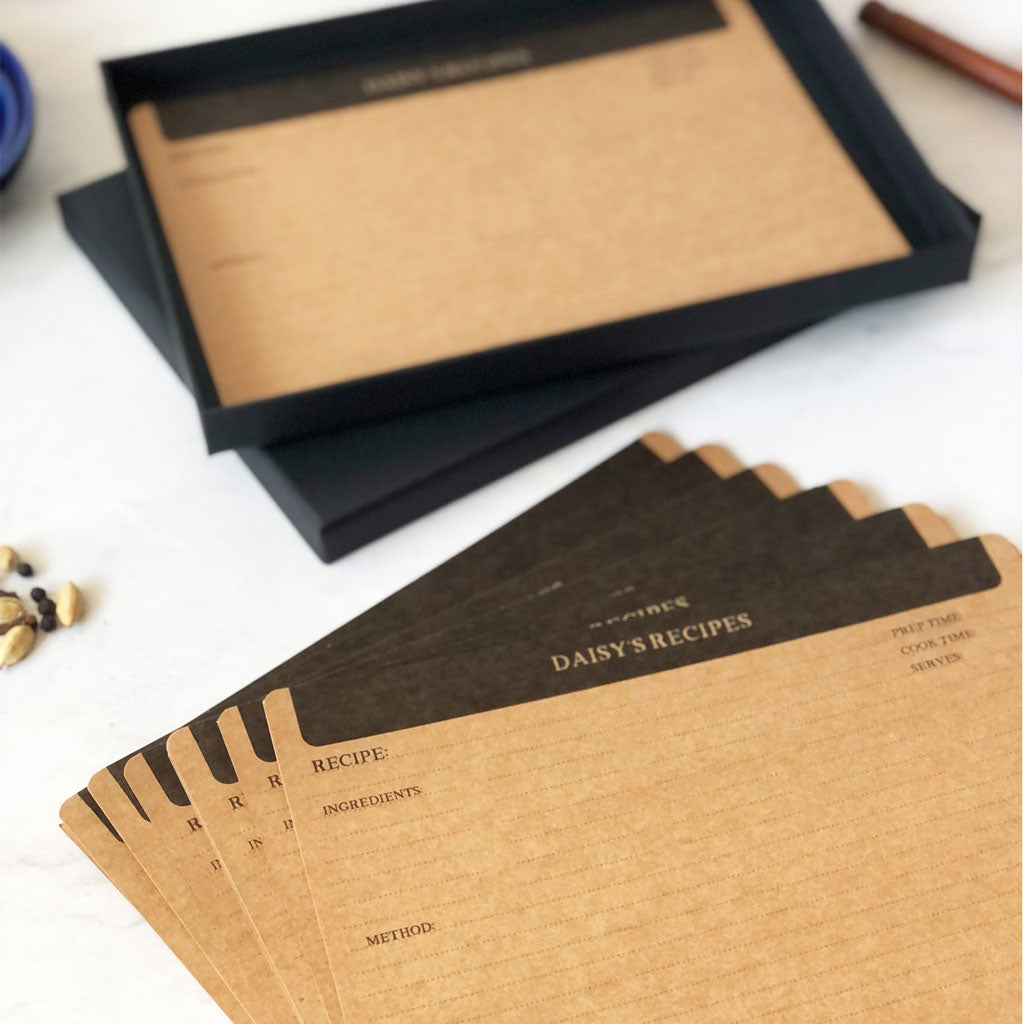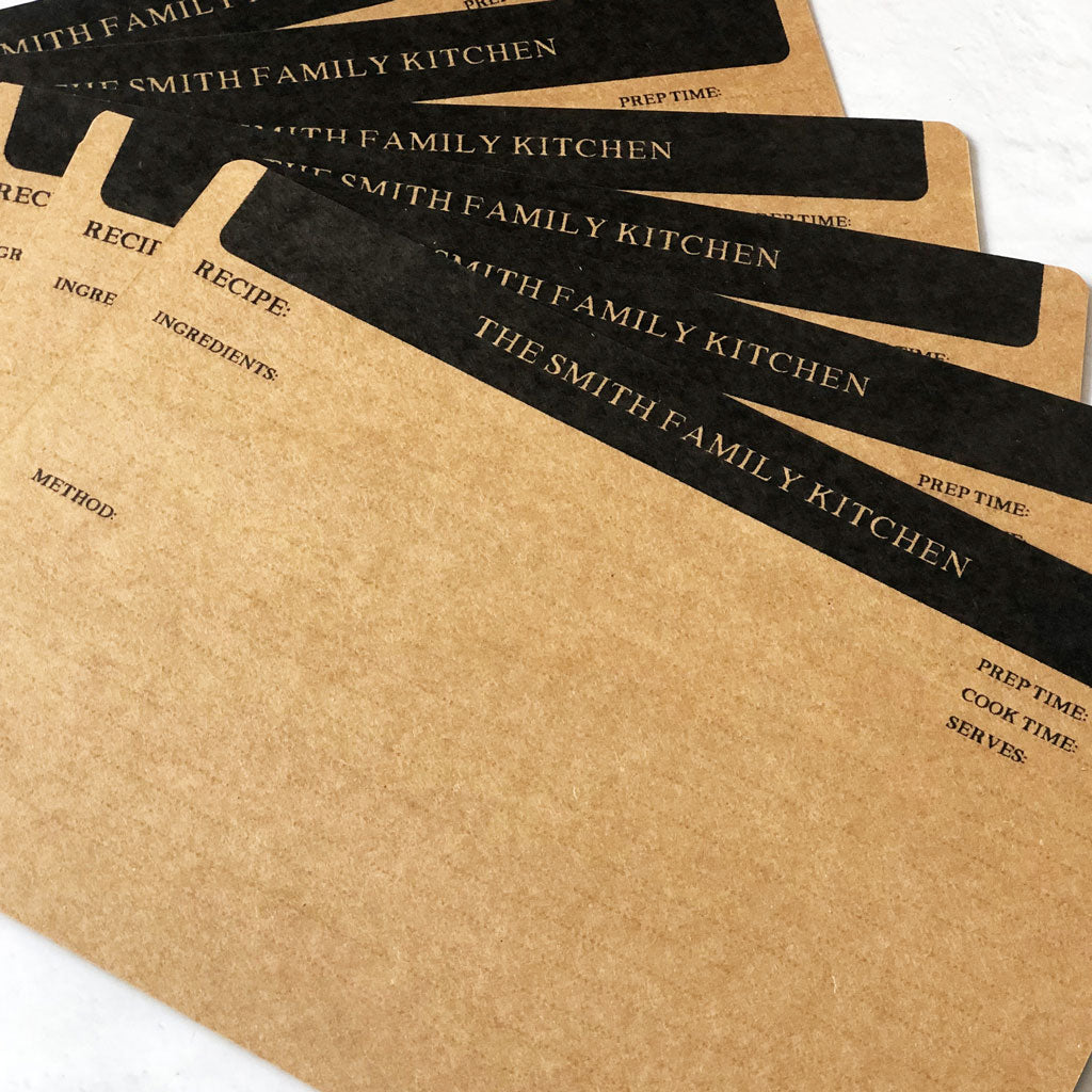 Blank recipe cards personalised with a custom printed header in sets of 20, 40 or 60 cards. Convenient to use and can be hole punched by you to use as inserts in a binder or in a recipe box.