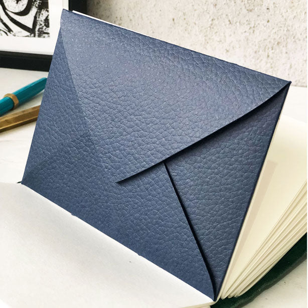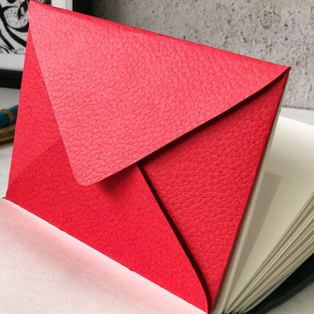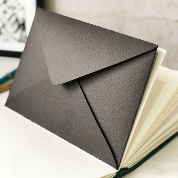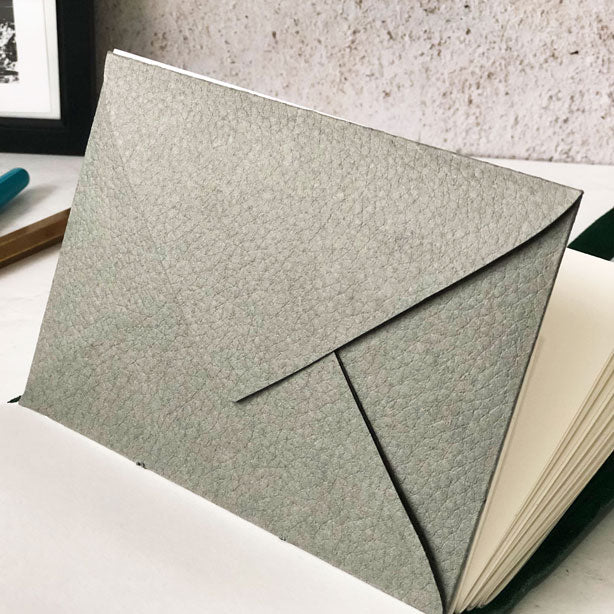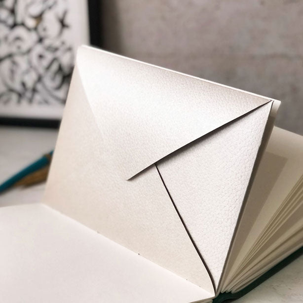 A luxurious leather look embossed card envelope hand stitched as an add on to your journal, perfect to hold loose notes or mementos within your book.