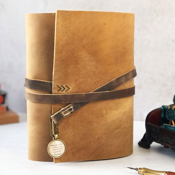 LEATHER COVER: Made from a waxy pull up leather that marks beautifully and just gets better with use and wear.- with a self leather wraparound tie.