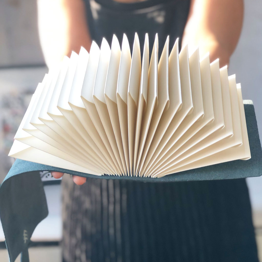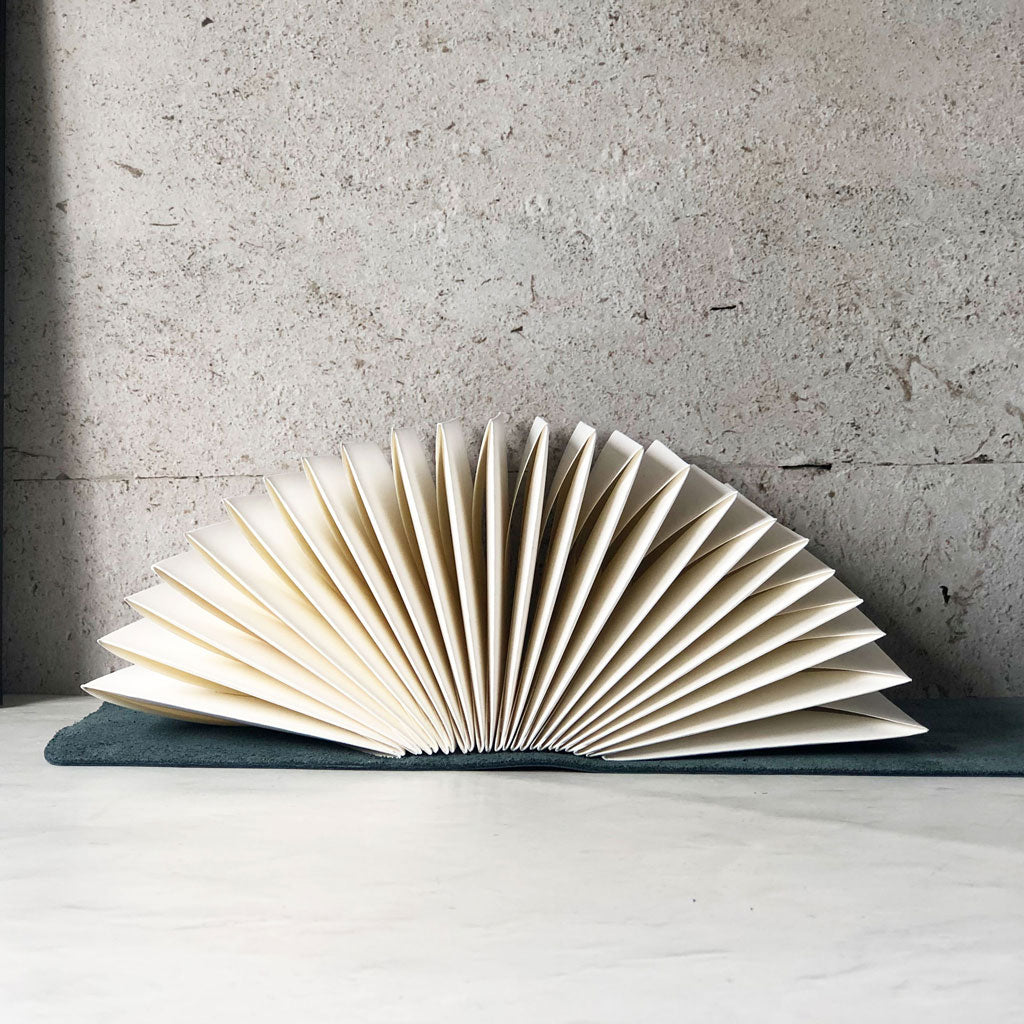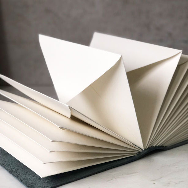 BINDING: Traditionally crafted, the envelopes are stitched into the leather cover by hand using a long stitch binding with waxed Irish linen thread.