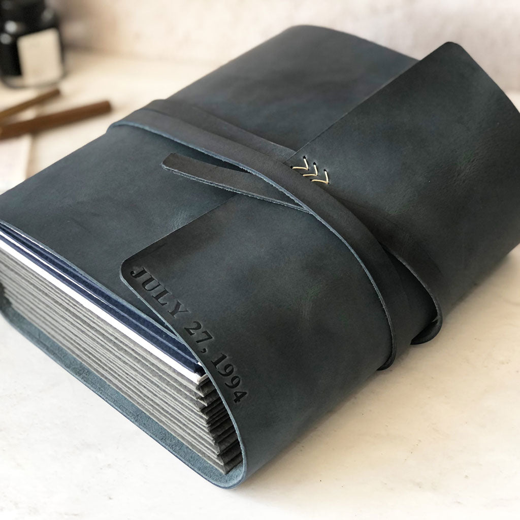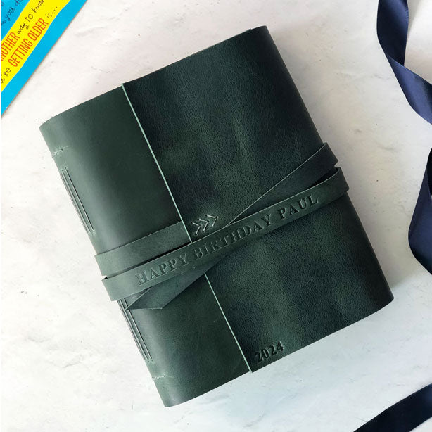 Personalised with hand embossed names or dates on the front cover or leather tie strap.