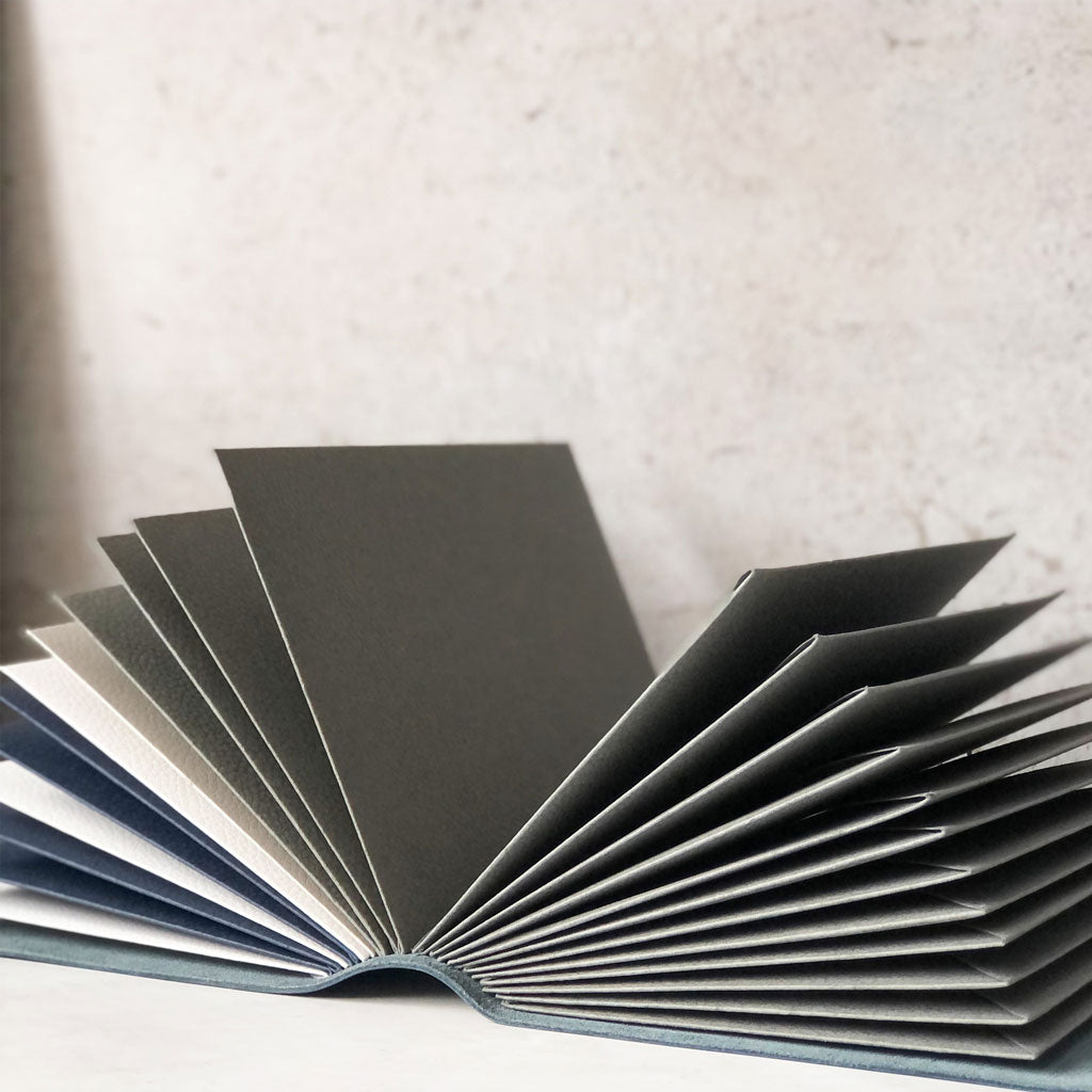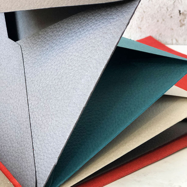 Main image shows Indigo Blue leather with Natural Thread and envelopes in Silver, Alabaster & Midnight
