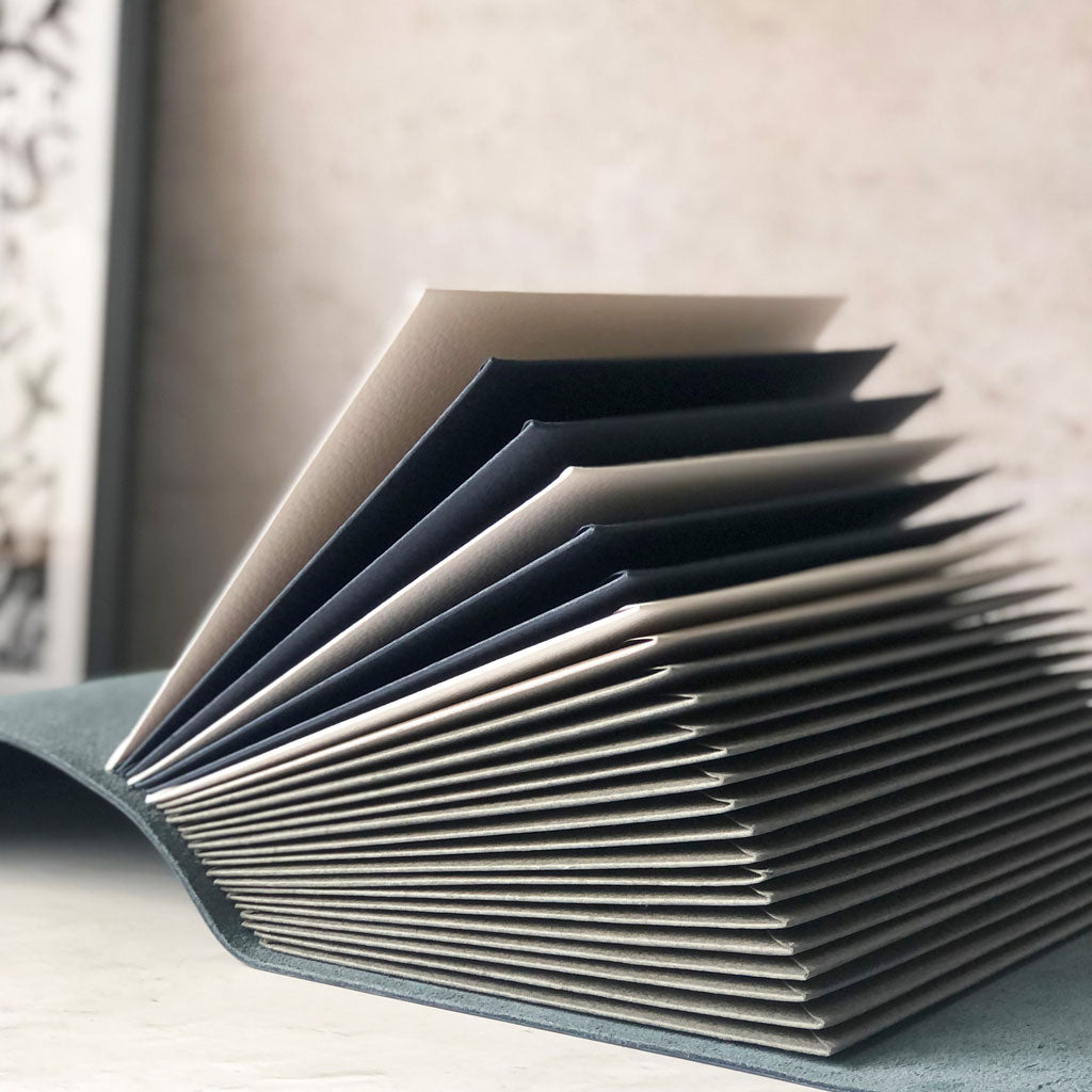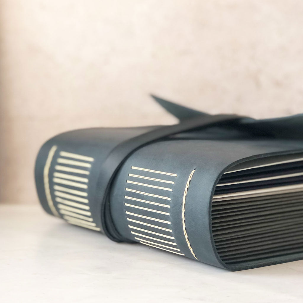 BINDING: Traditionally crafted, the envelopes are stitched into the leather cover by hand using a long stitch binding with waxed Irish linen thread.