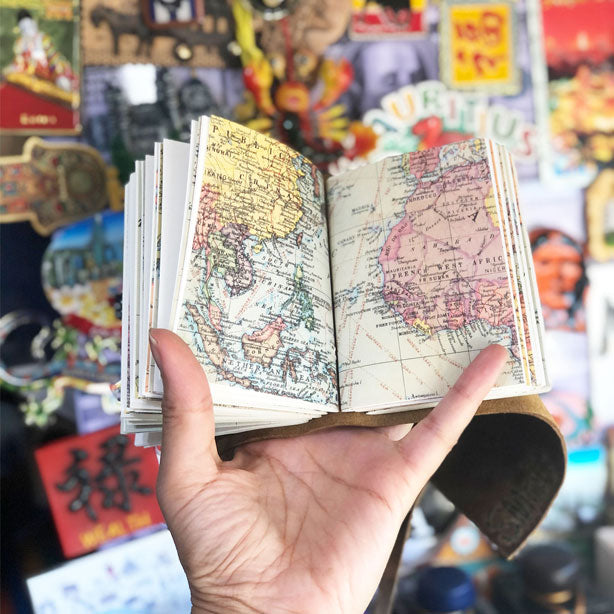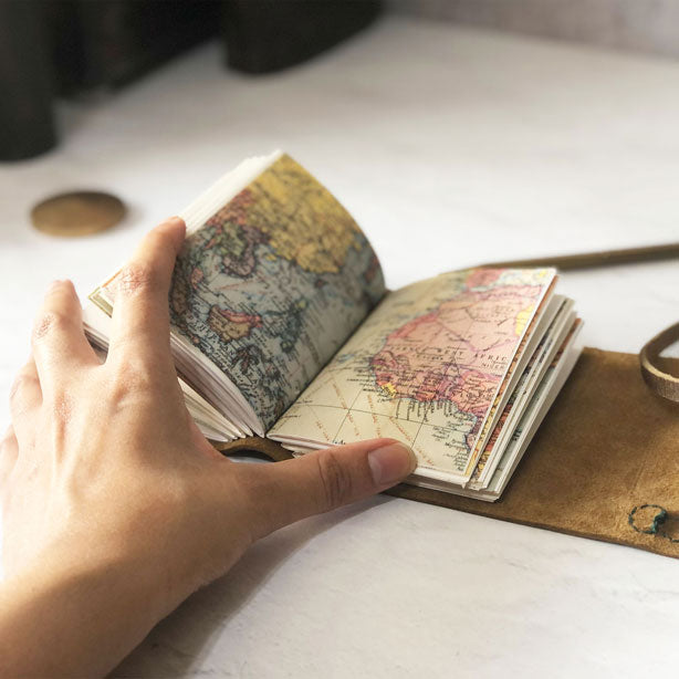 The ideal place to record your thoughts or jot down a quick sketch, this mini leather pocket journal is the perfect travel companion and is compact enough to fit into small pocket or purse. Its's a cute gift for a writer or traveller. The internal pages are blank and include 8 map pages made from random sections of a vintage world map or you can choose to have 32 map pages, using up the whole world map.