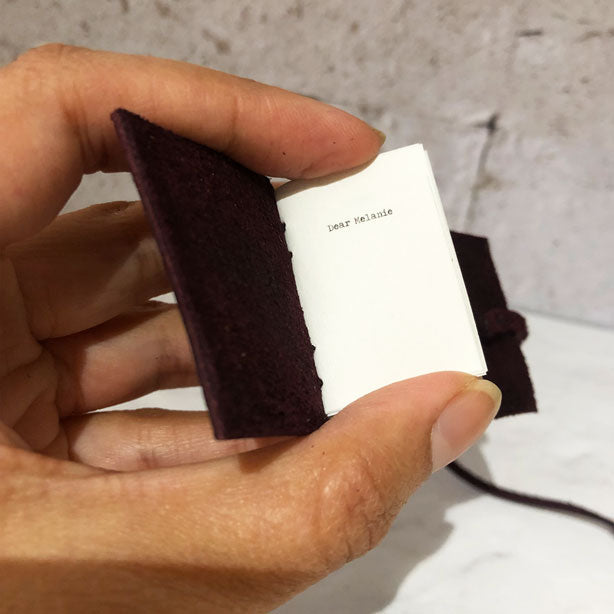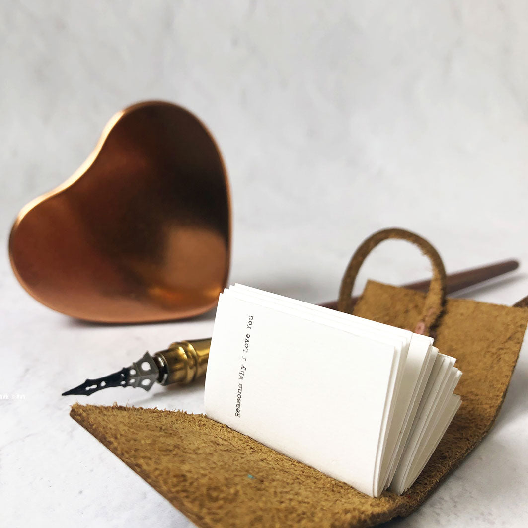 Melt a heart with this tiny little personalised miniature leather bound journal that's small enough to fit into the palm of your hand. It can be printed with 'Reasons why I love you' as shown or with your own custom text. It's bound using the same long stitch binding method as our larger journals and is completely functional . It will be custom made in your choice of leather and binding thread colours making it totally unique to you. Comes presented in a mini heart shaped tin.