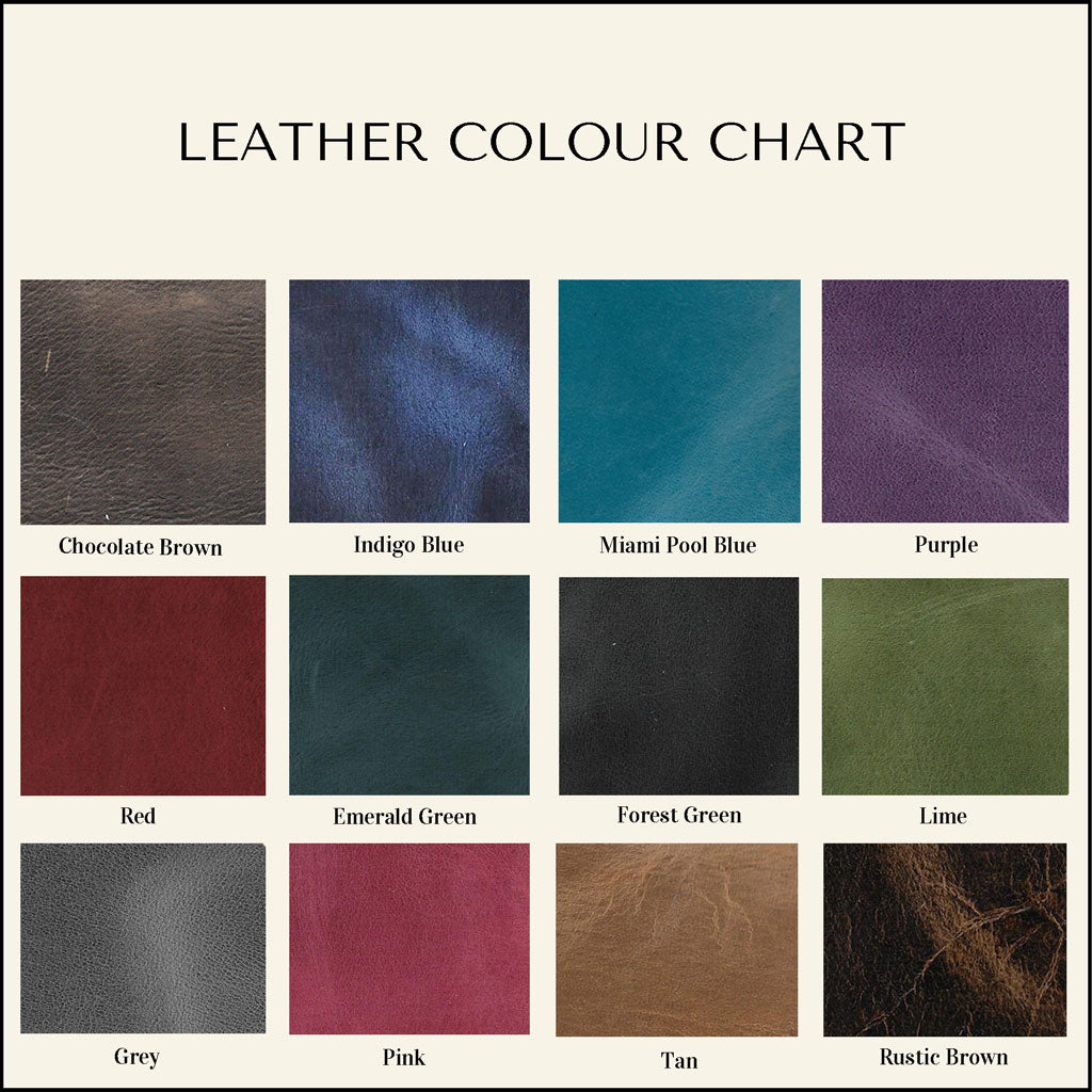 Main images show is Rustic Brown leather with Rose thread, Purple leather, Miami Pool Blue leather.