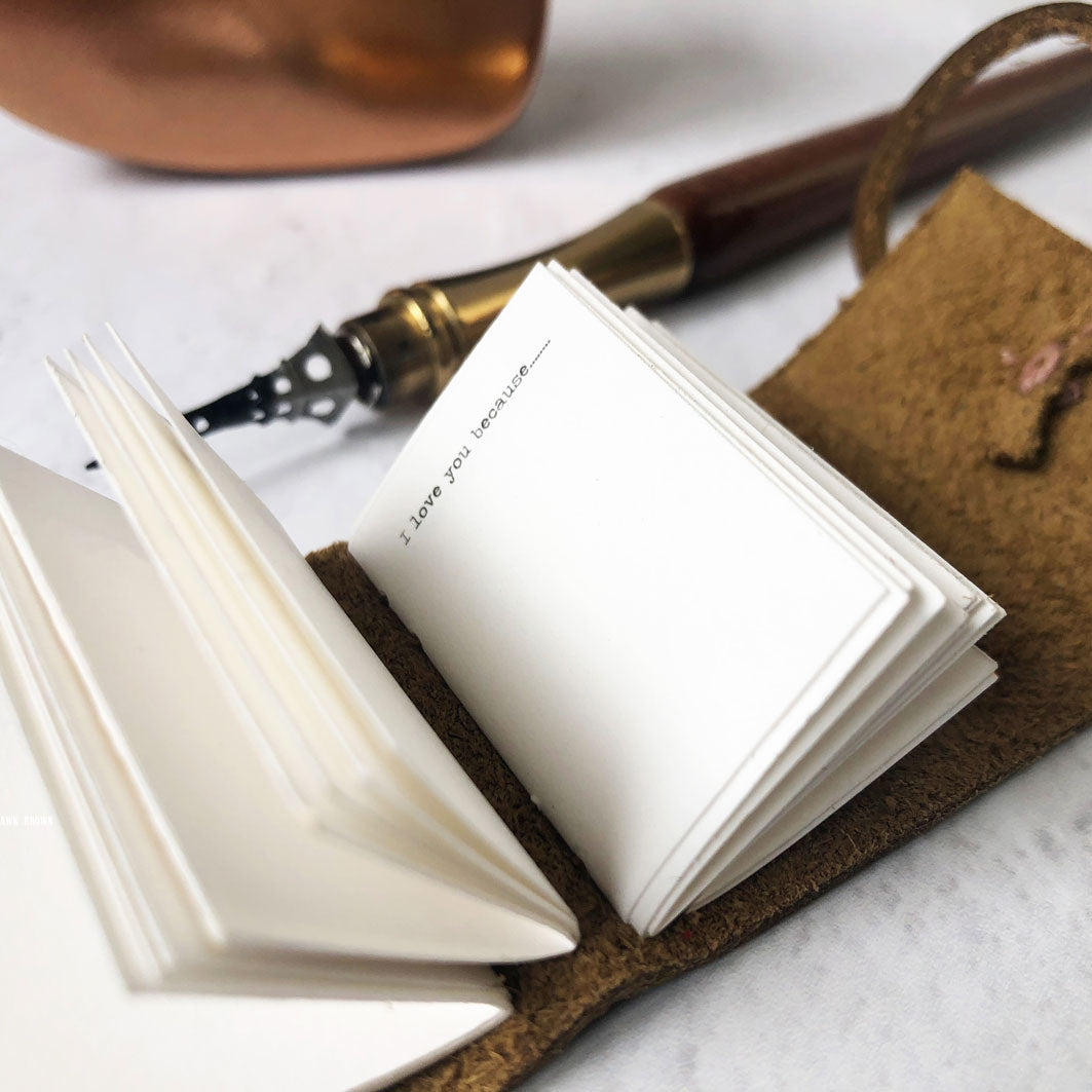 - Paper inside approx 2.6cm x 3.7cm or approx 1" x 1.3"LEATHER COVER: Pull up leather that marks and wears beautifully and just gets better with use with a self leather wraparound tie.PAPER QUALITY: 140gsm blank acid free blank cartridge paper perfect for dry media or simply just for writing.PRINT:Title page will be printed with 'Reasons why I love you' or you can have your own custom message.All remaining right facing pages will be printed with 'I love you because....' or you can have your own custom wording or leave the pages blank.PAGE COUNT: 32 pages/64 sidesBINDING: Traditionally bound, the pages are stitched into the leather cover by hand using a long stitch binding with waxed Irish linen thread.EMBOSSED MONOGRAM ADD ON: Hand stamped monogram initials or words upto a maximum of 6 letters including characters can me embossed onto the leather cover.Select the number of letters or characters you require from the drop down menu and type them in the text prompt box.COMES GIFT BOXED IN A MATT SILVER OR ROSE GOLD HEART SHAPED TIN WITH LID