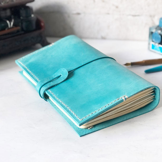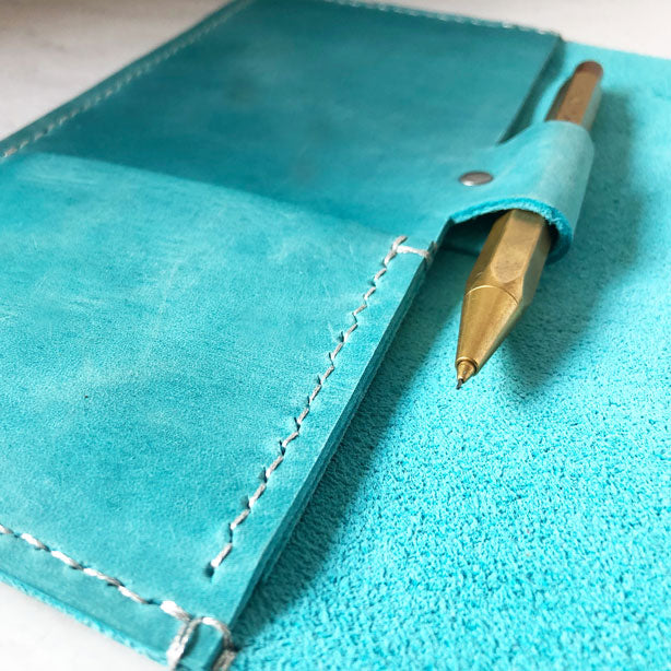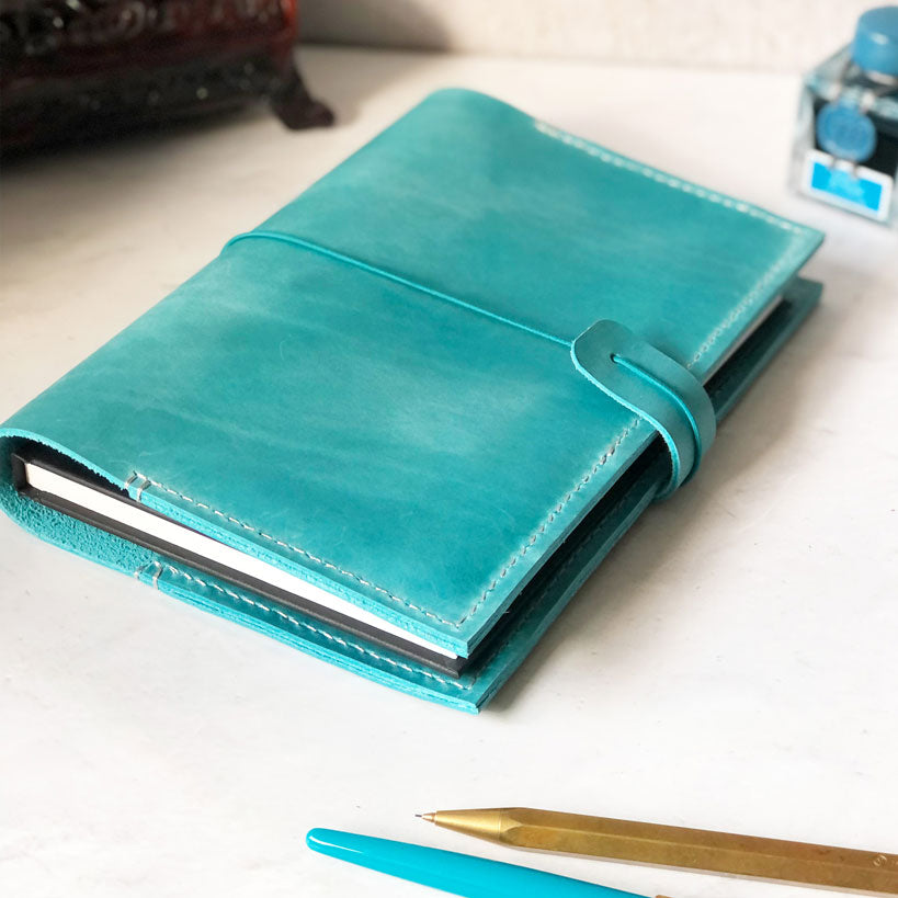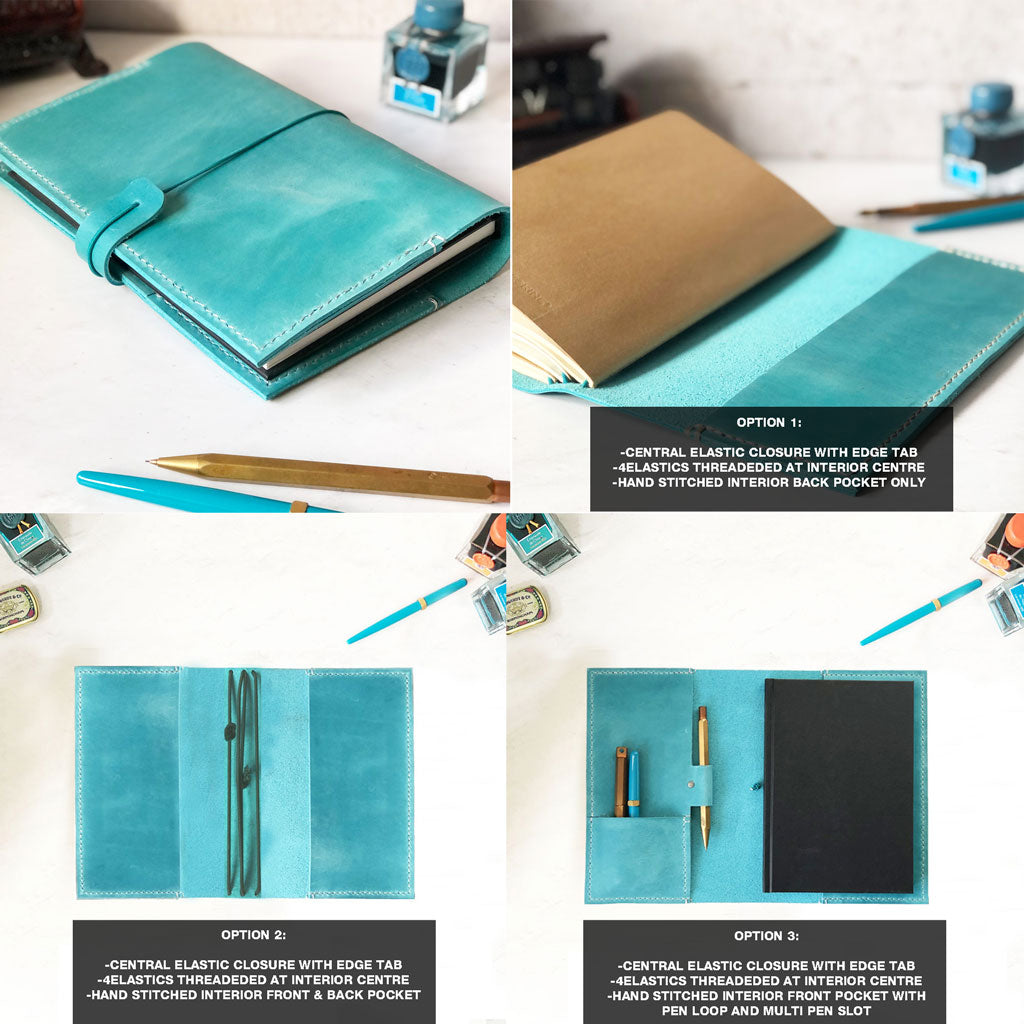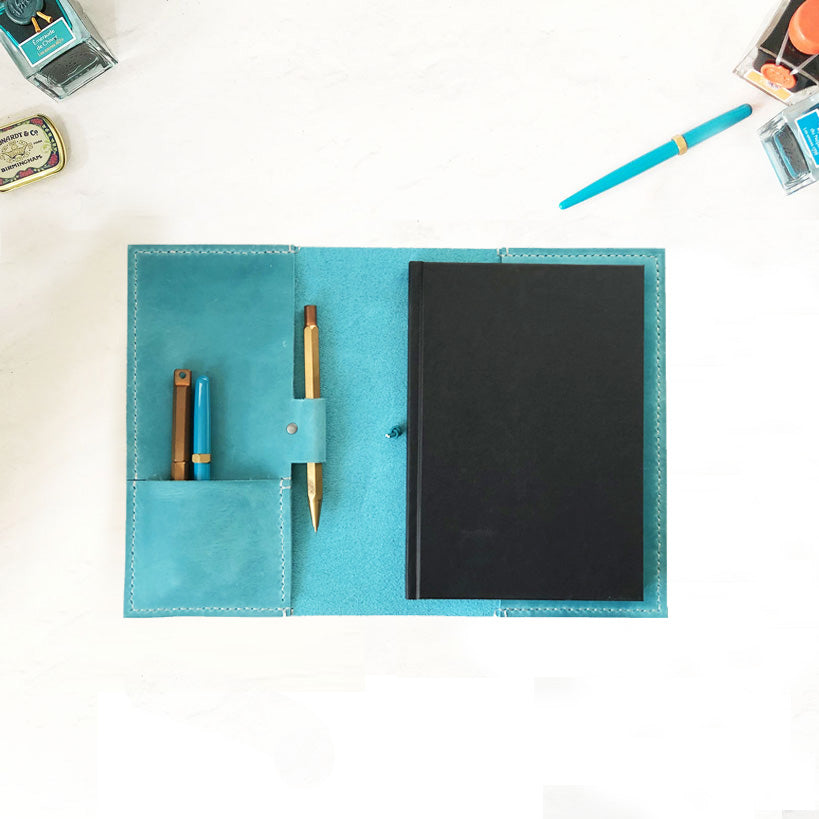 A leather notebook cover with hand stitched interior pockets and optional pen loop and multi pen slots.