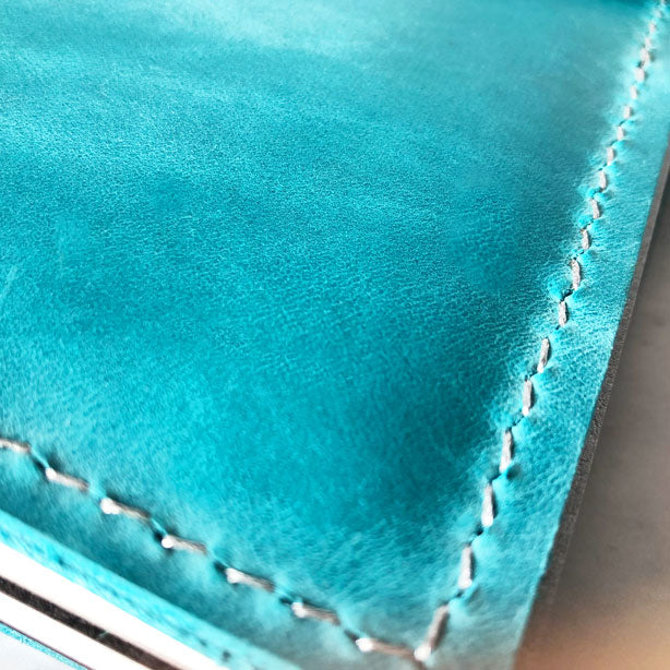 Main image shown is Miami Pool Blue leather with Metallic Silver stitching.