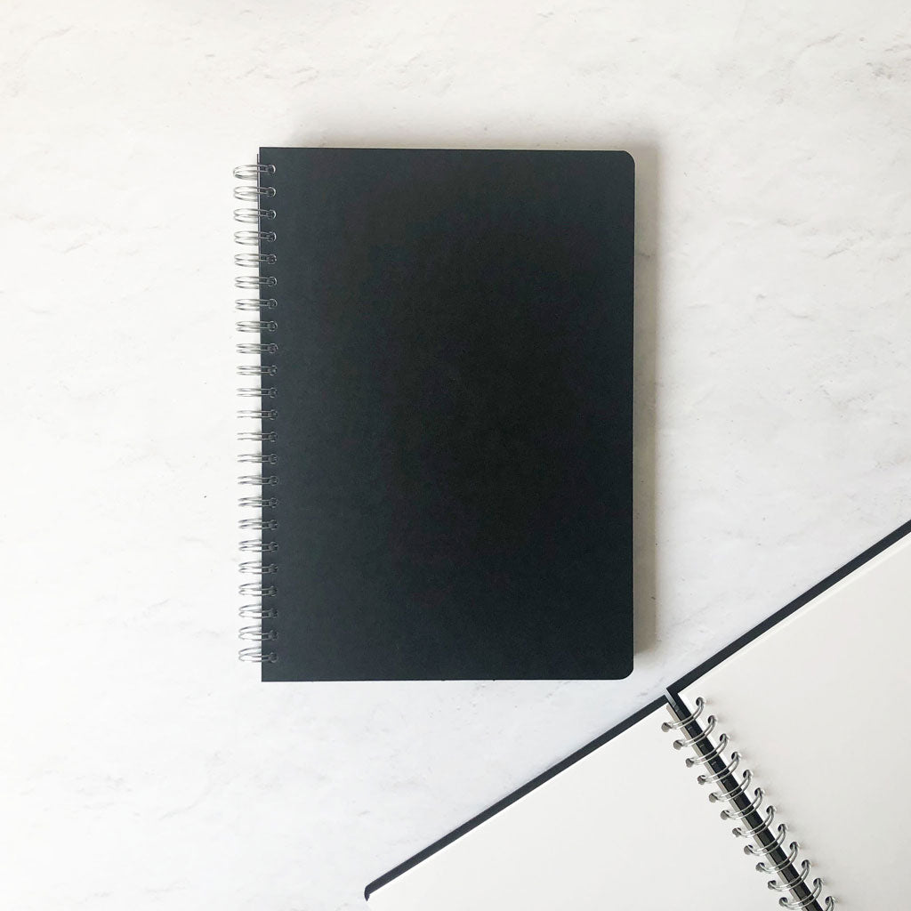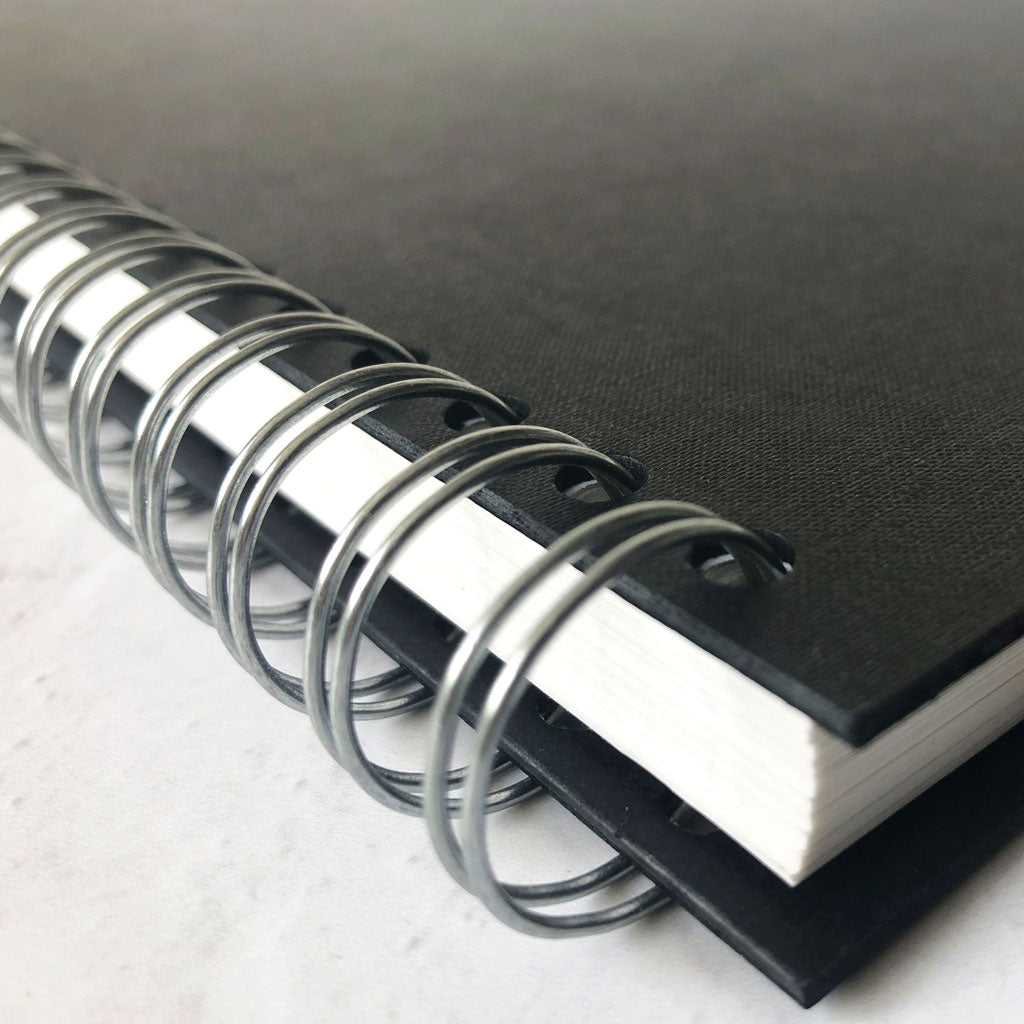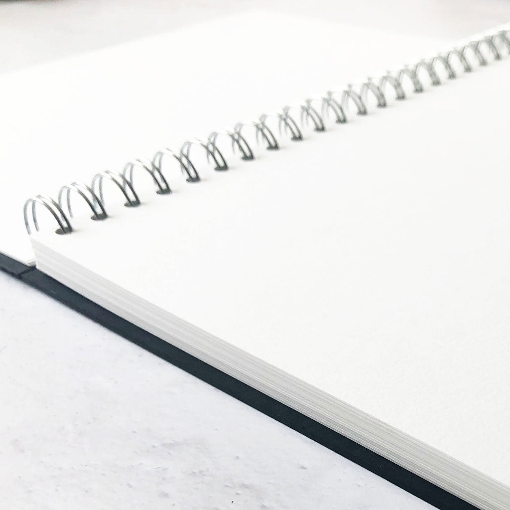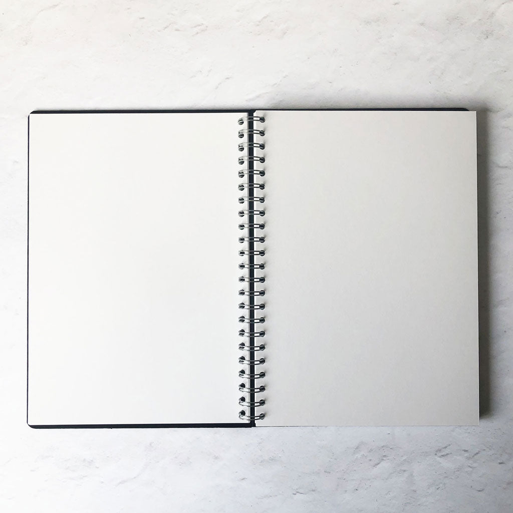 Black cover spiral bound sketchbook with acid free all media cartridge paper pages, perfect for use with mixed media or to use as a journal or scrapbook.