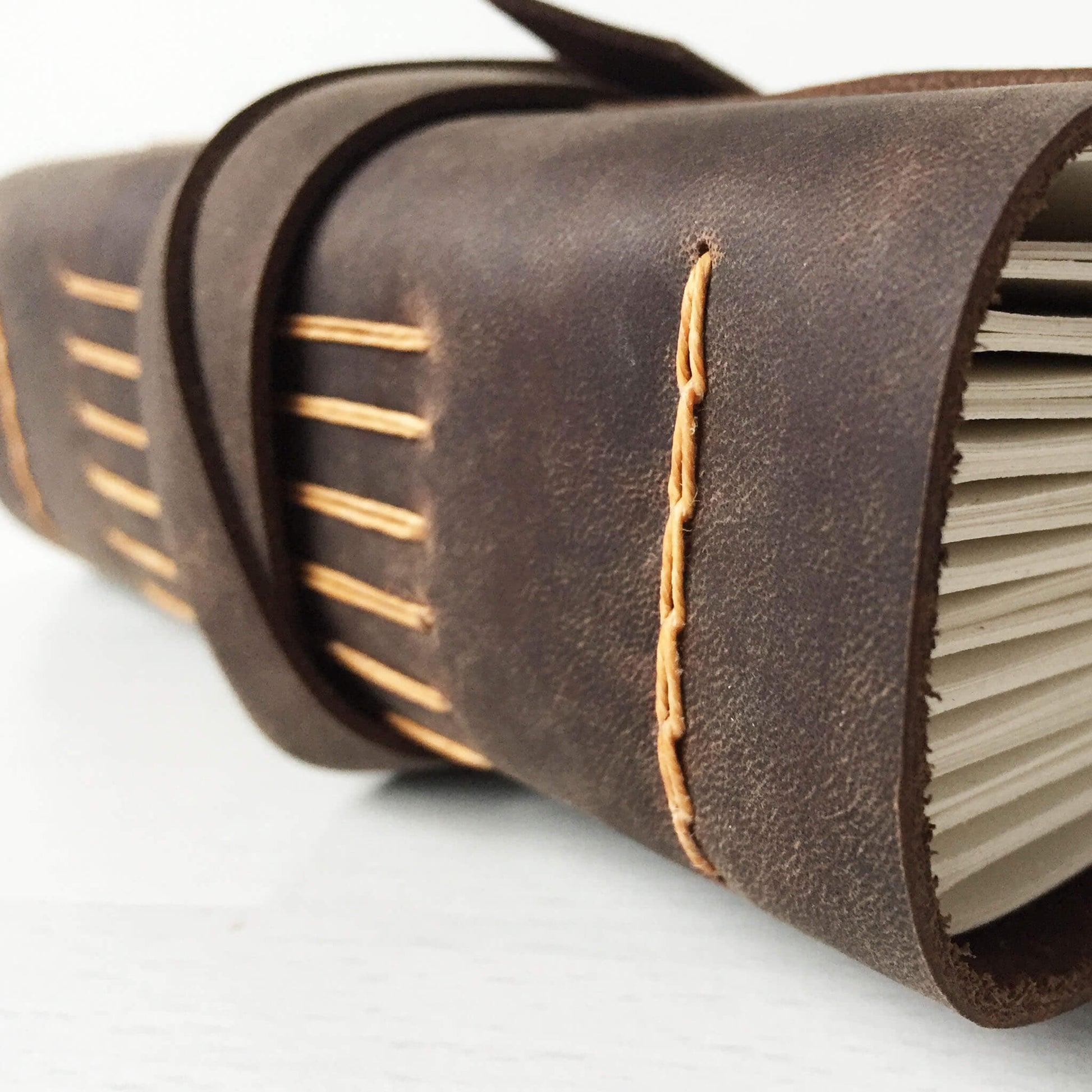 BINDING: Traditionally crafted, the pages are stitched into the leather cover by hand using a long stitch binding with waxed Irish linen thread.
